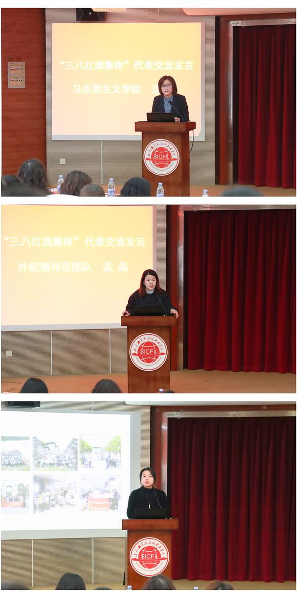 随后,马克思主义学院院长沈李、外国语言文化学院副院长孟晶、艺术设计与传媒学院教师郑舒文分别代表获奖集体和个人发言,分享了团队合作、爱岗敬业、教书育人的先进事迹和努力拼搏、不断进取的人生感悟。优秀代表们的发言,表达了对学校为女教职工们提供发展平台和关怀支持的感恩之情,以及对教育事业的无限热爱与崇敬。