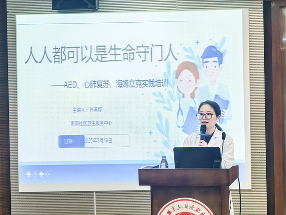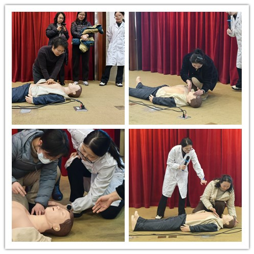 本次讲座邀请了惠南社区卫生服务中心全科主治医师、康复医师,团支部书记孙燕婷医生担任主讲。她以《人人都可以是生命守门人》为题,介绍了常见急救场景的应急救护方法,如心肺复苏法、海姆立克急救法等。她以通俗易懂的语言,清晰明了地讲解了心肺复苏(CPR)的标准操作流程,包括初步判断、紧急呼救、胸外按压、开放气道、人工呼吸等关键步骤,并强调了按压速率(每分钟100-120次)、按压深度(至少5-6厘米)以及按压与人工呼吸比例(30:2)等要点;同时现场演示了正确的急救操作步骤。在互动环节,部分教职工根据提供的模拟道具亲自实践操作,孙医生现场进行指导纠正。